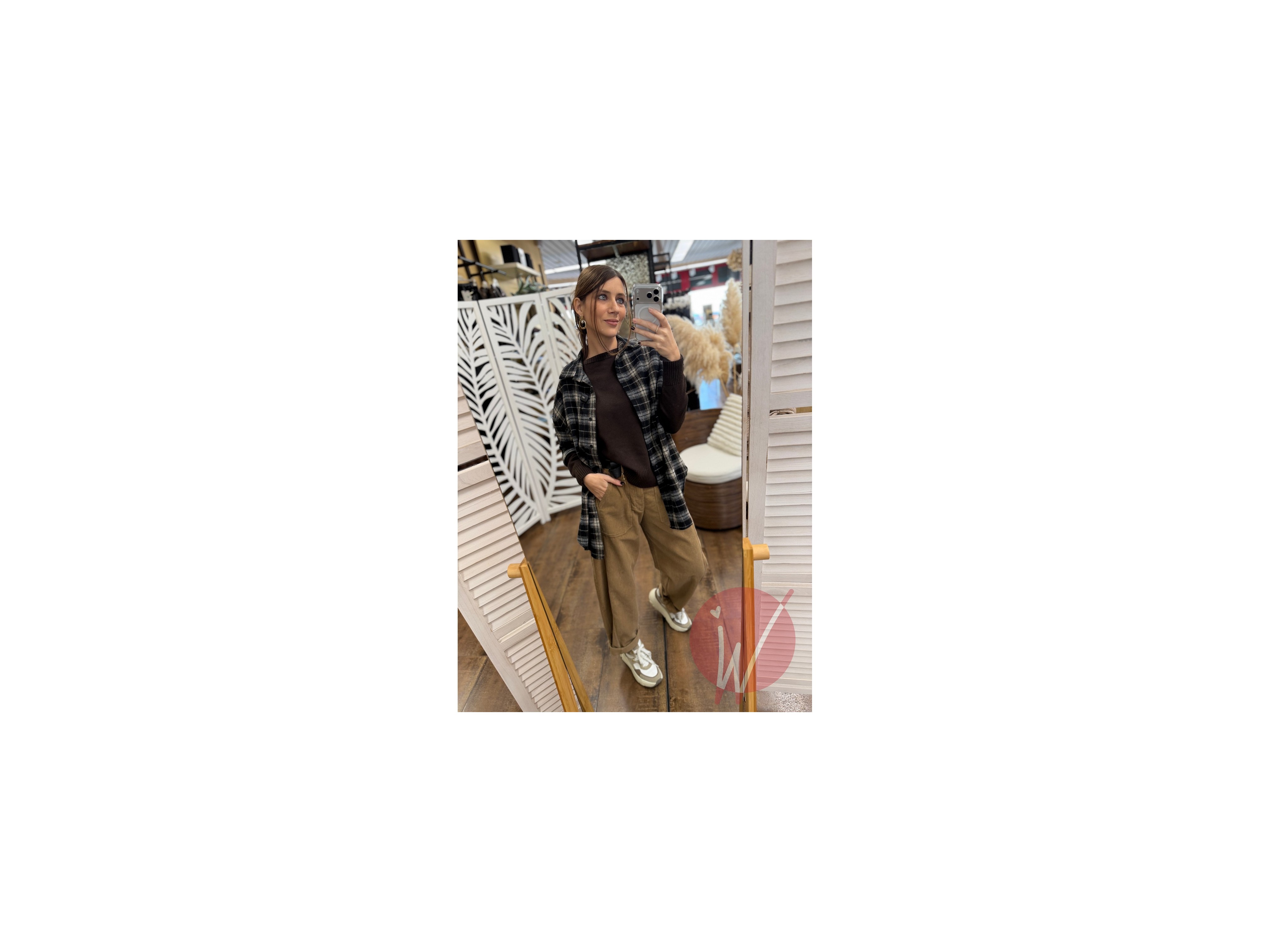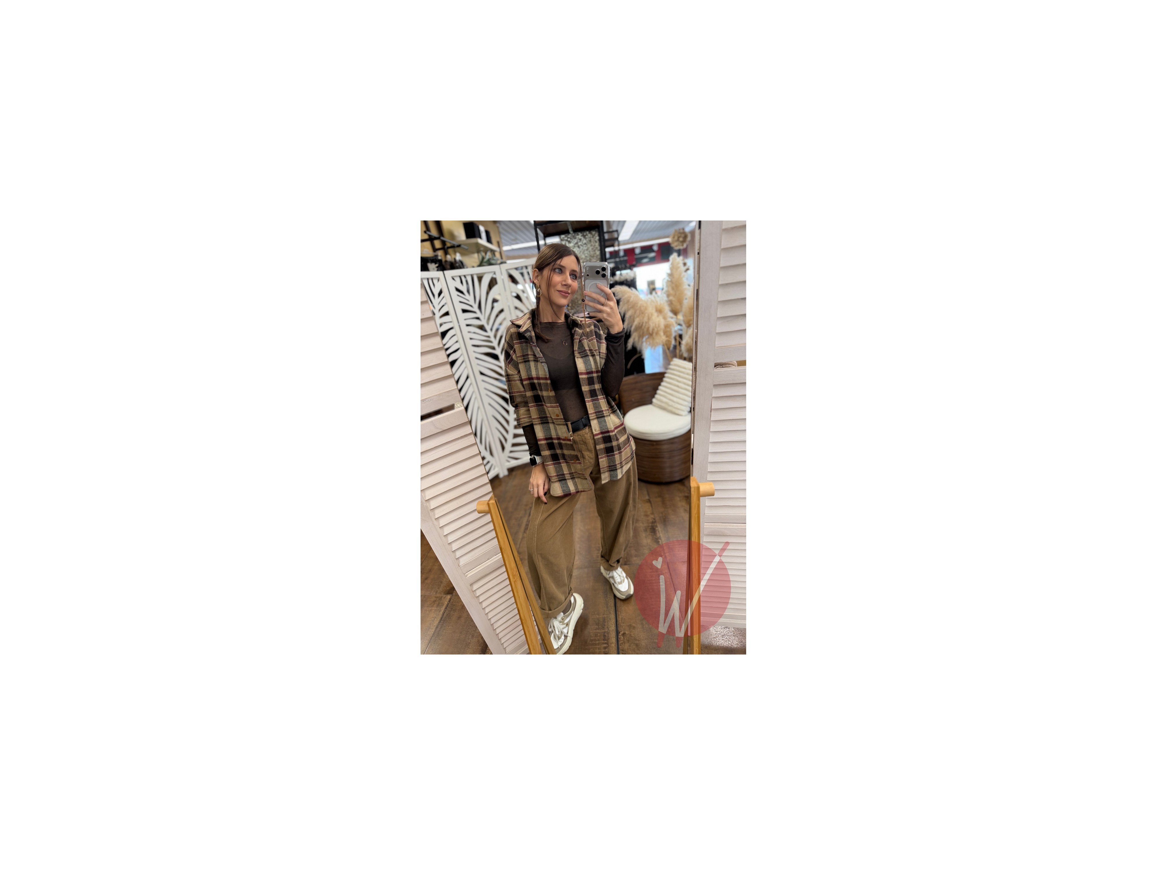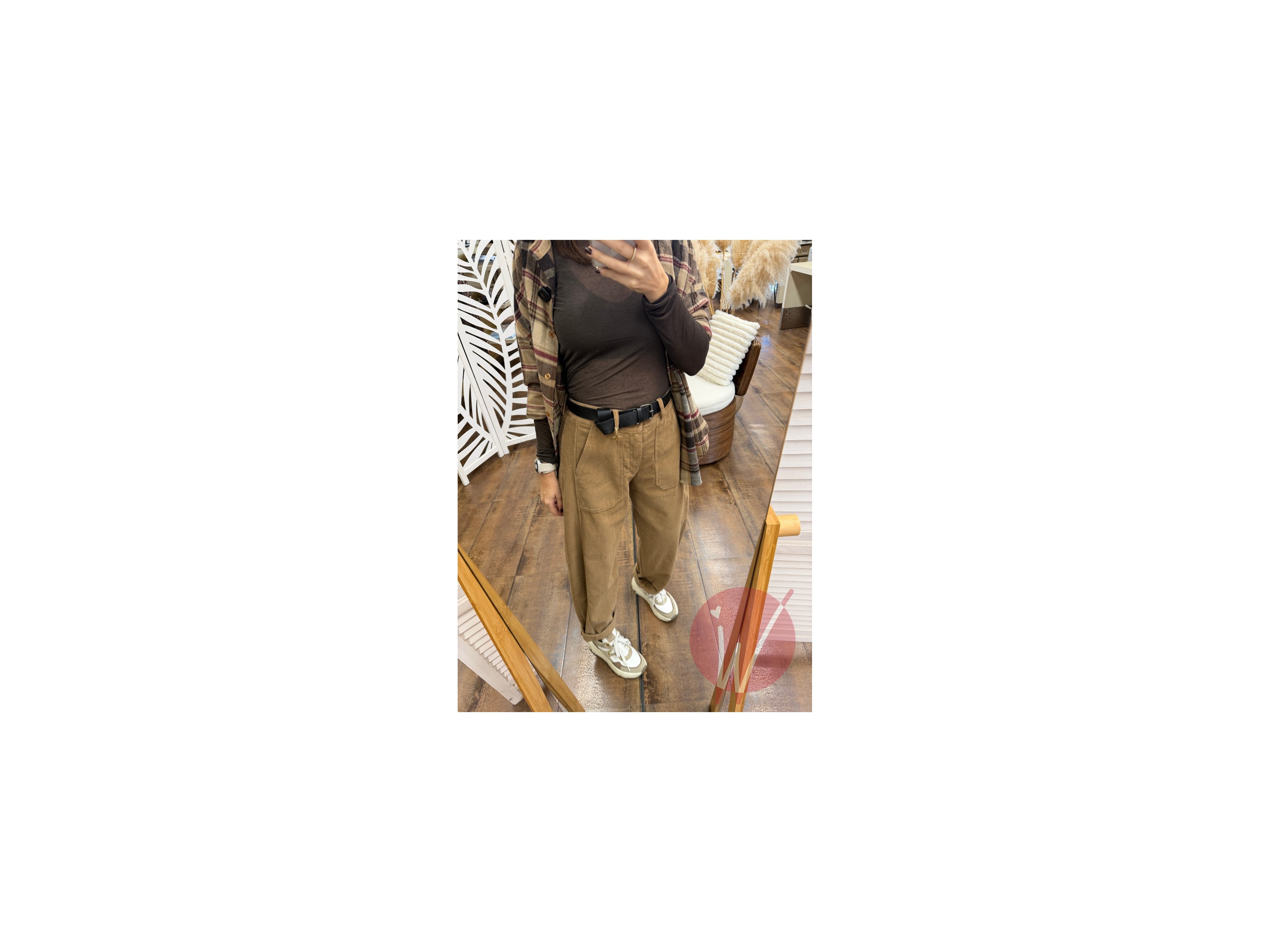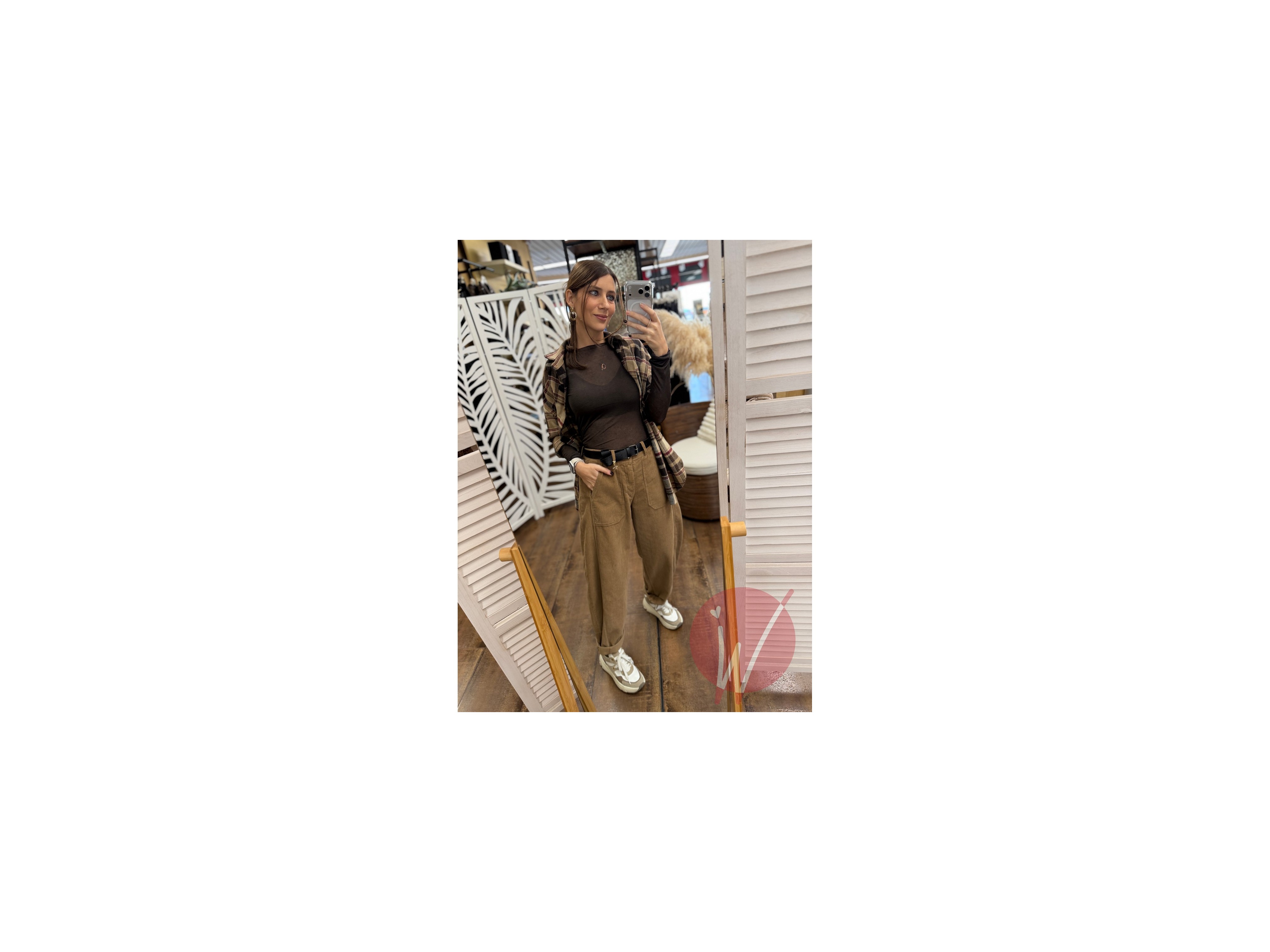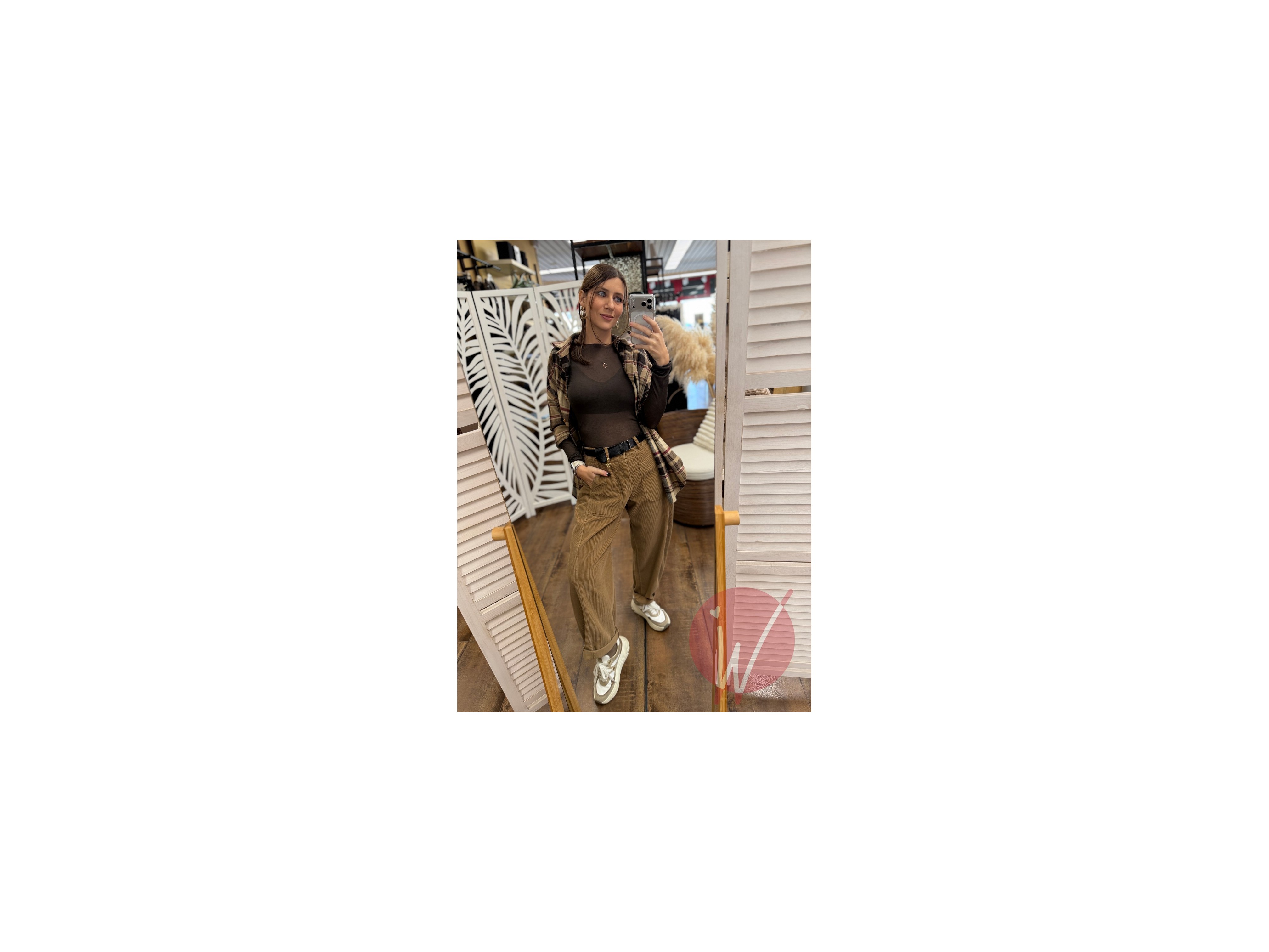 Pantalone modello baggy ad ovetto, in velluto millerighe, con tasche squadrate davanti, elastico in vita sul retro, chiusura con zip e bottone.