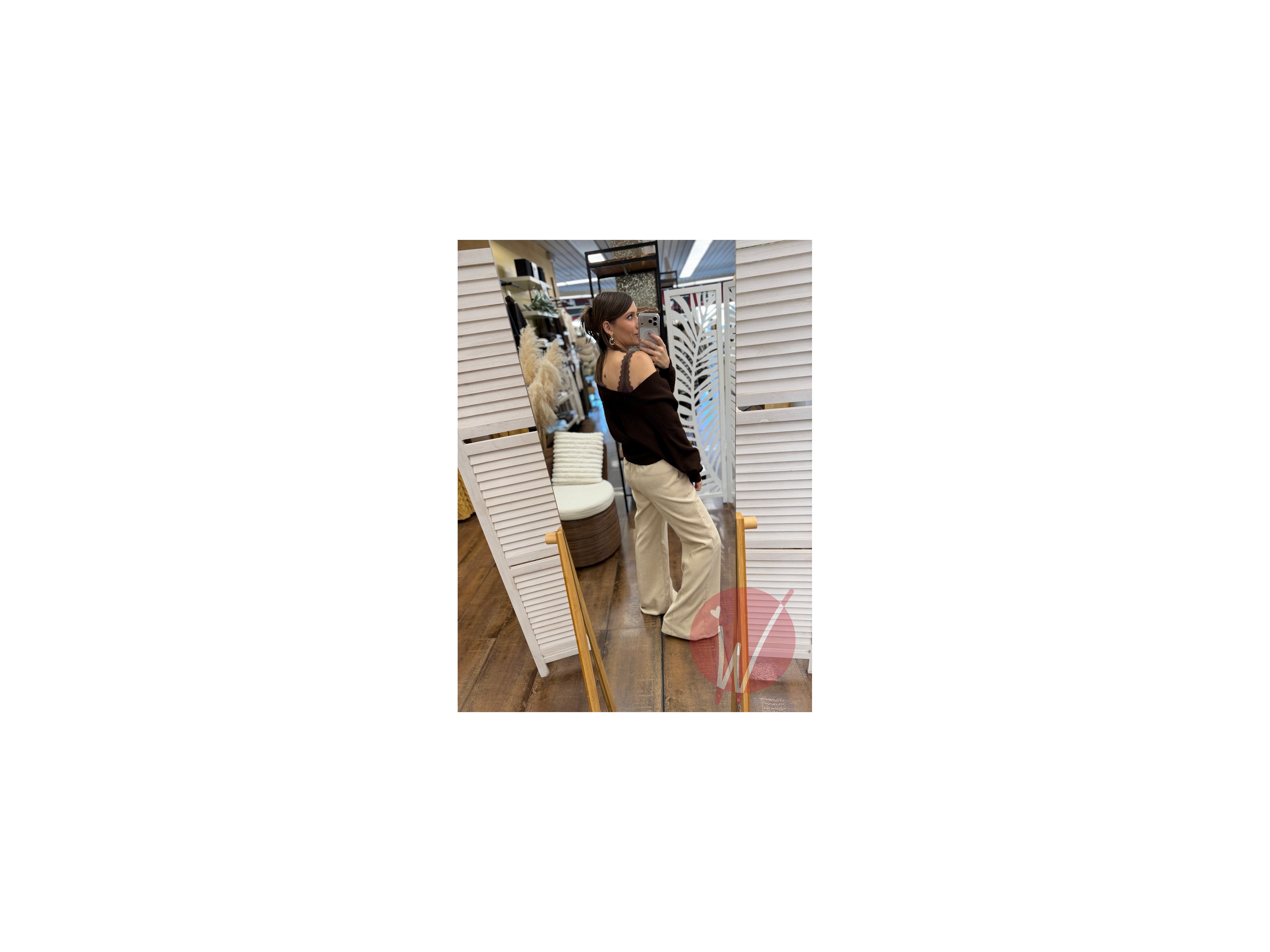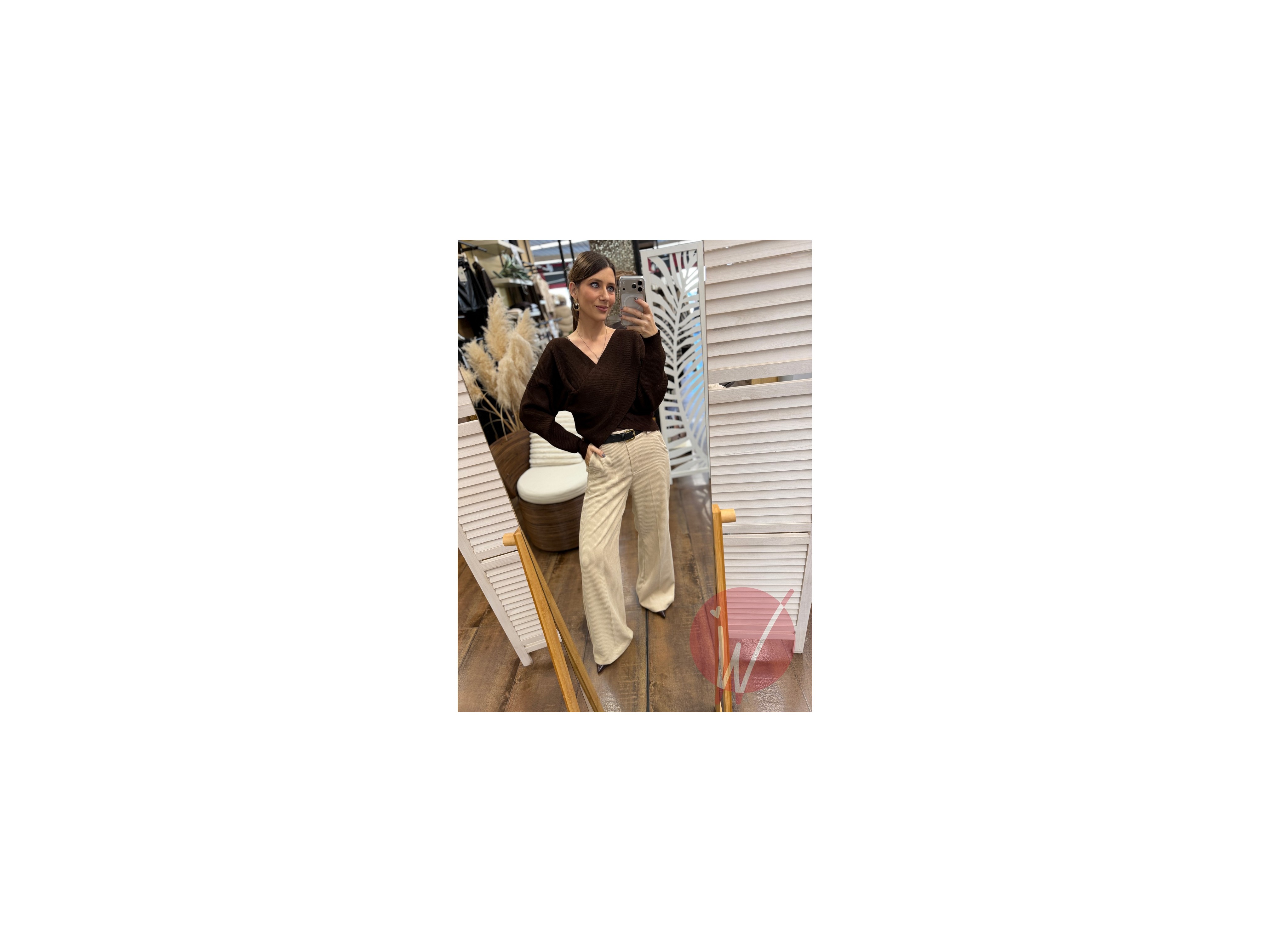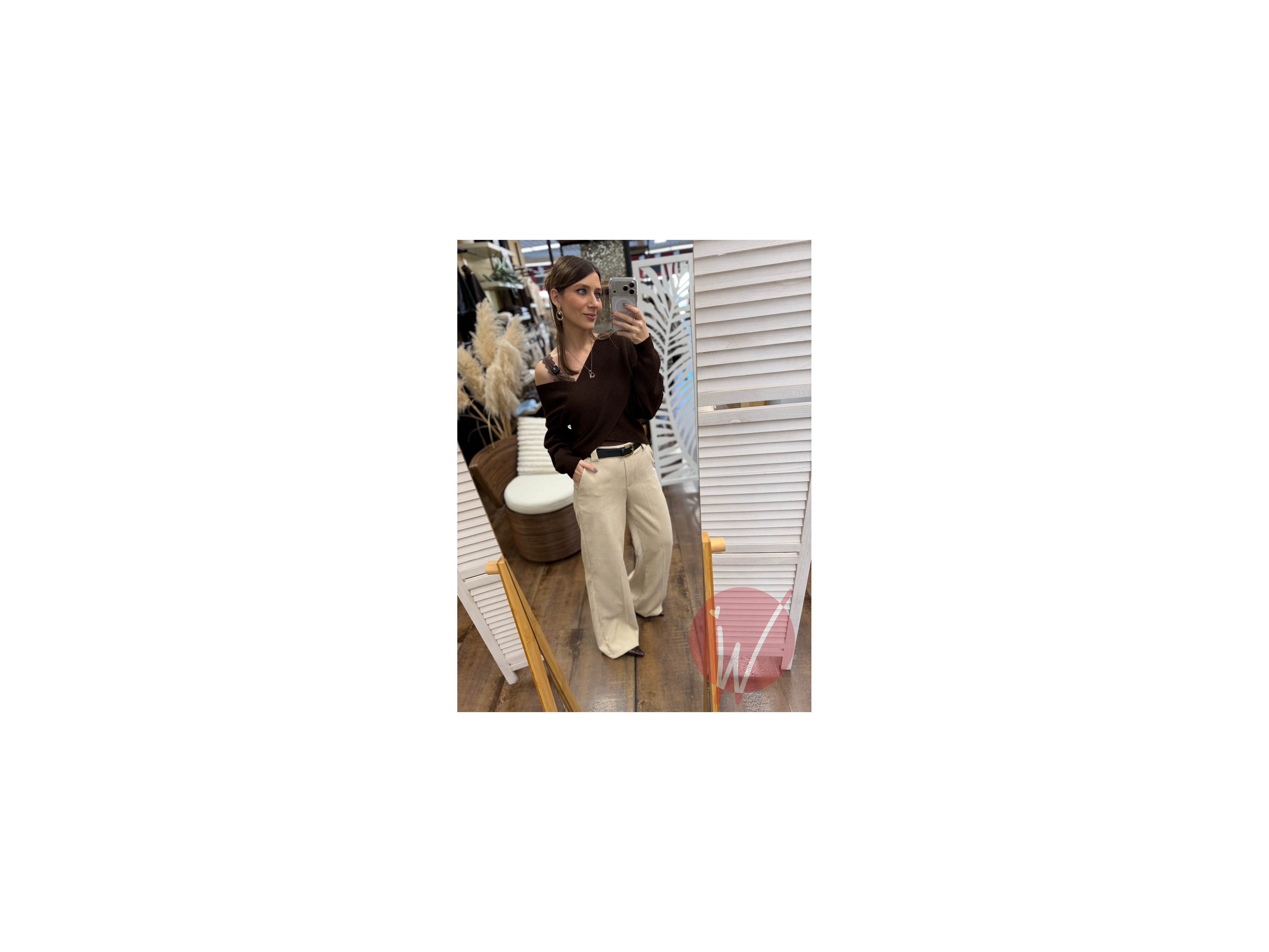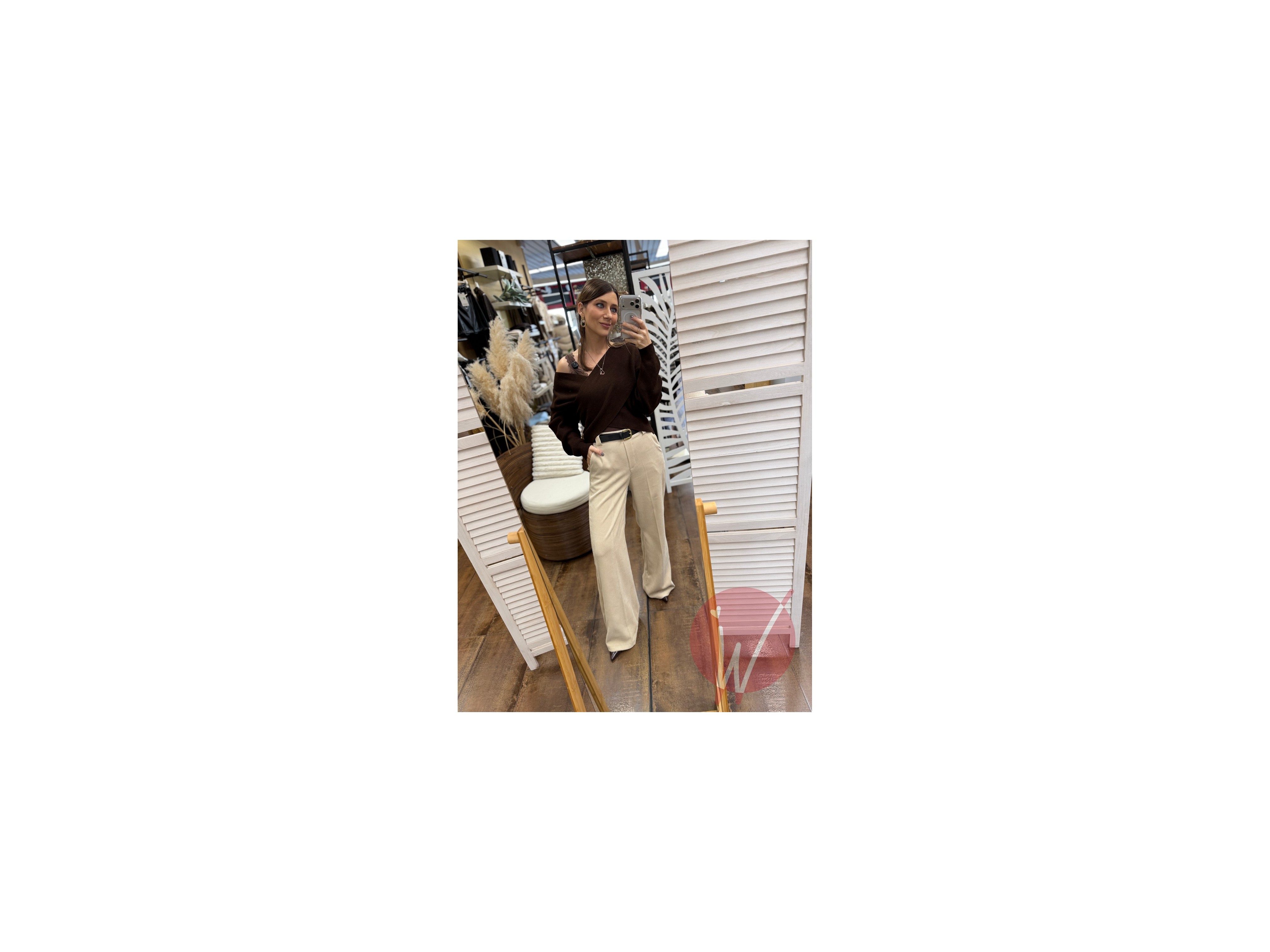 Pantalone palazzo in velluto morbido e caldo, a costine, tasche laterali in piedi, elastico in vita sul retro, passanti e cintura inclusa.