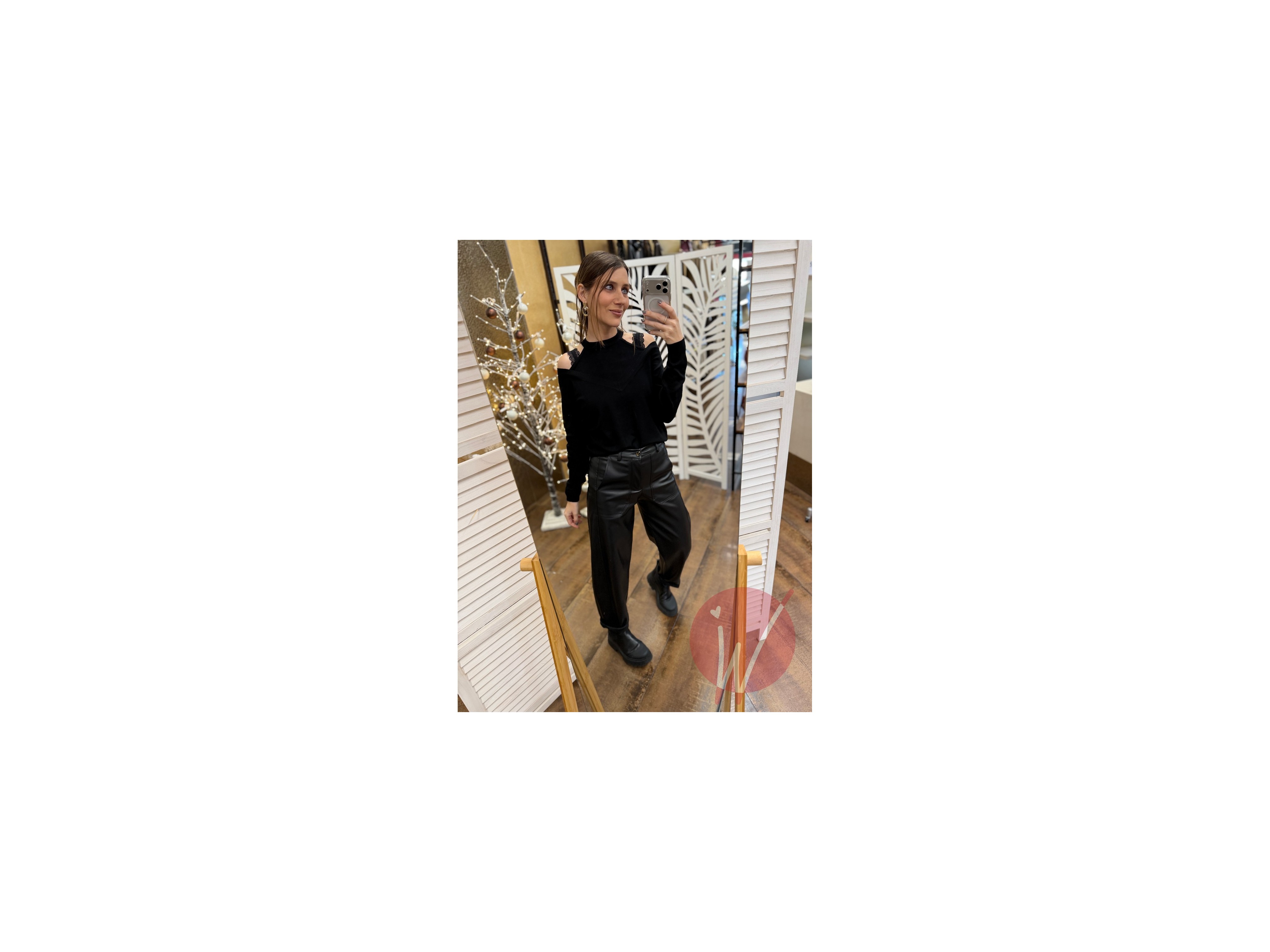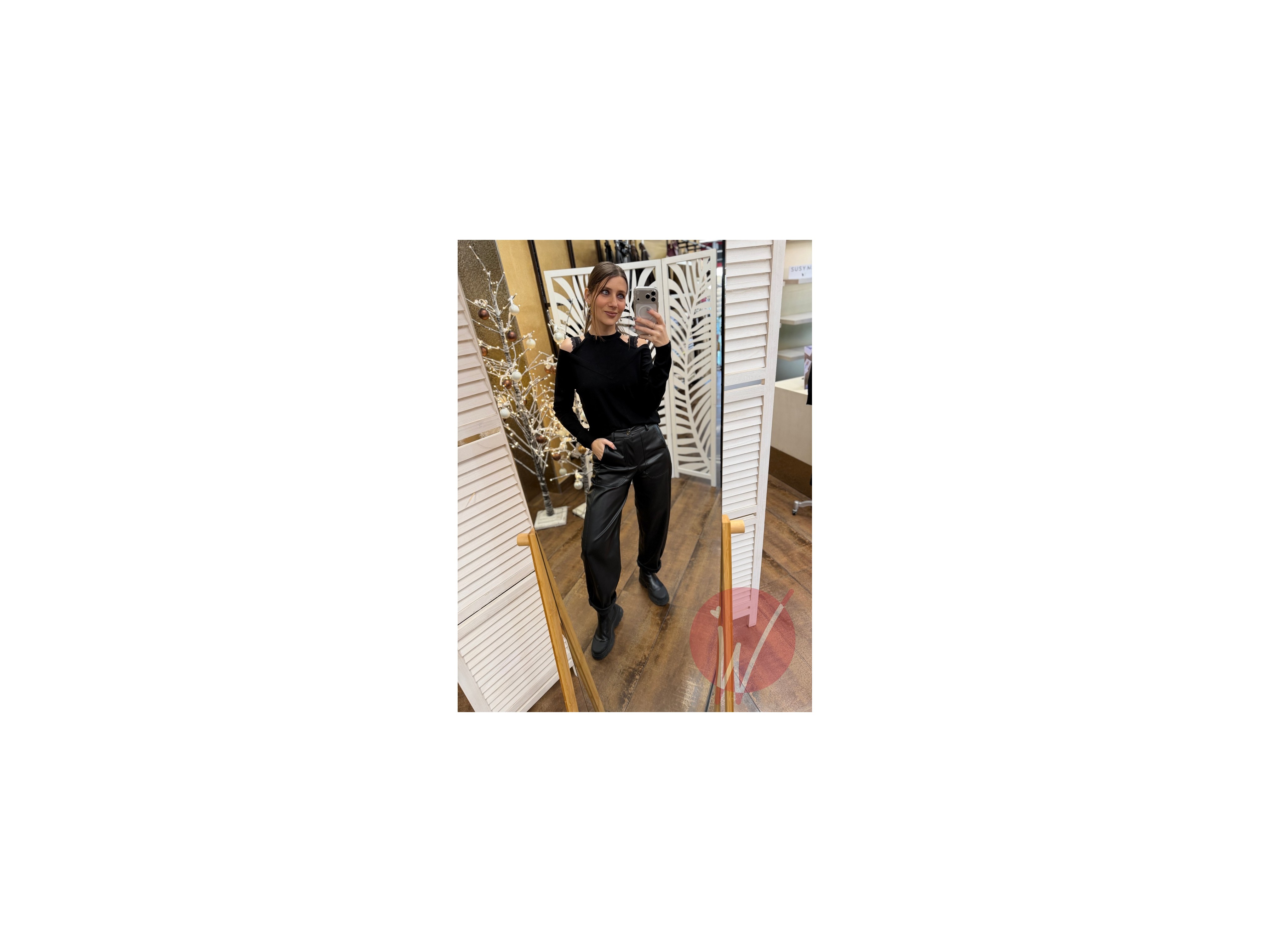 Pantalone in ecopelle, modello baggy, scamosciato caldo all'interno, con elastico in vita sul retro, chiusura con bottone e zip, tasche ampie davanti.