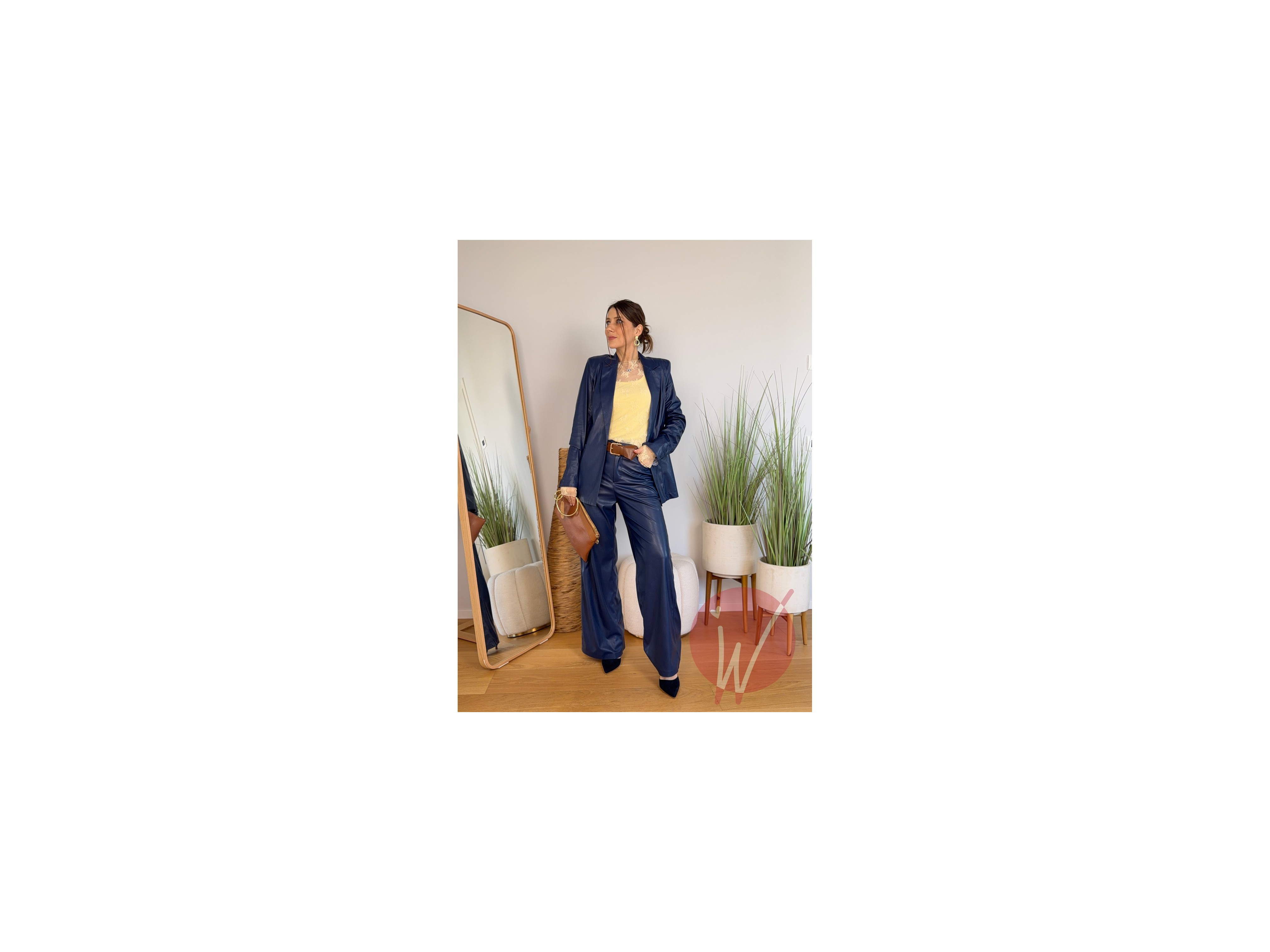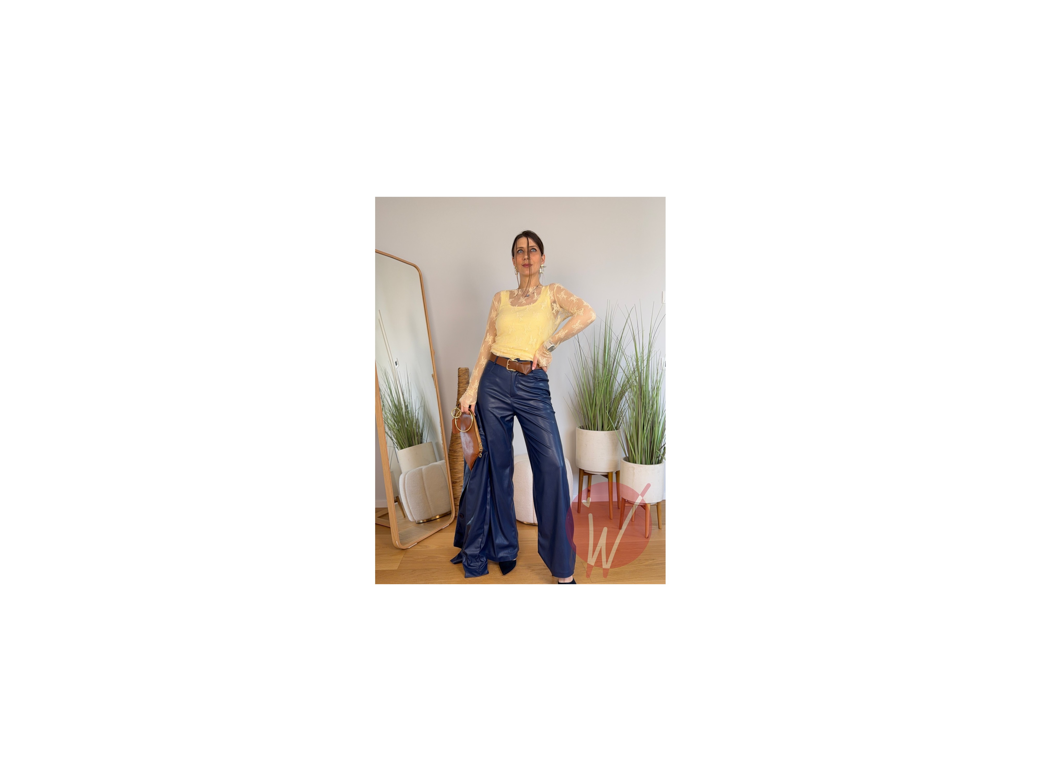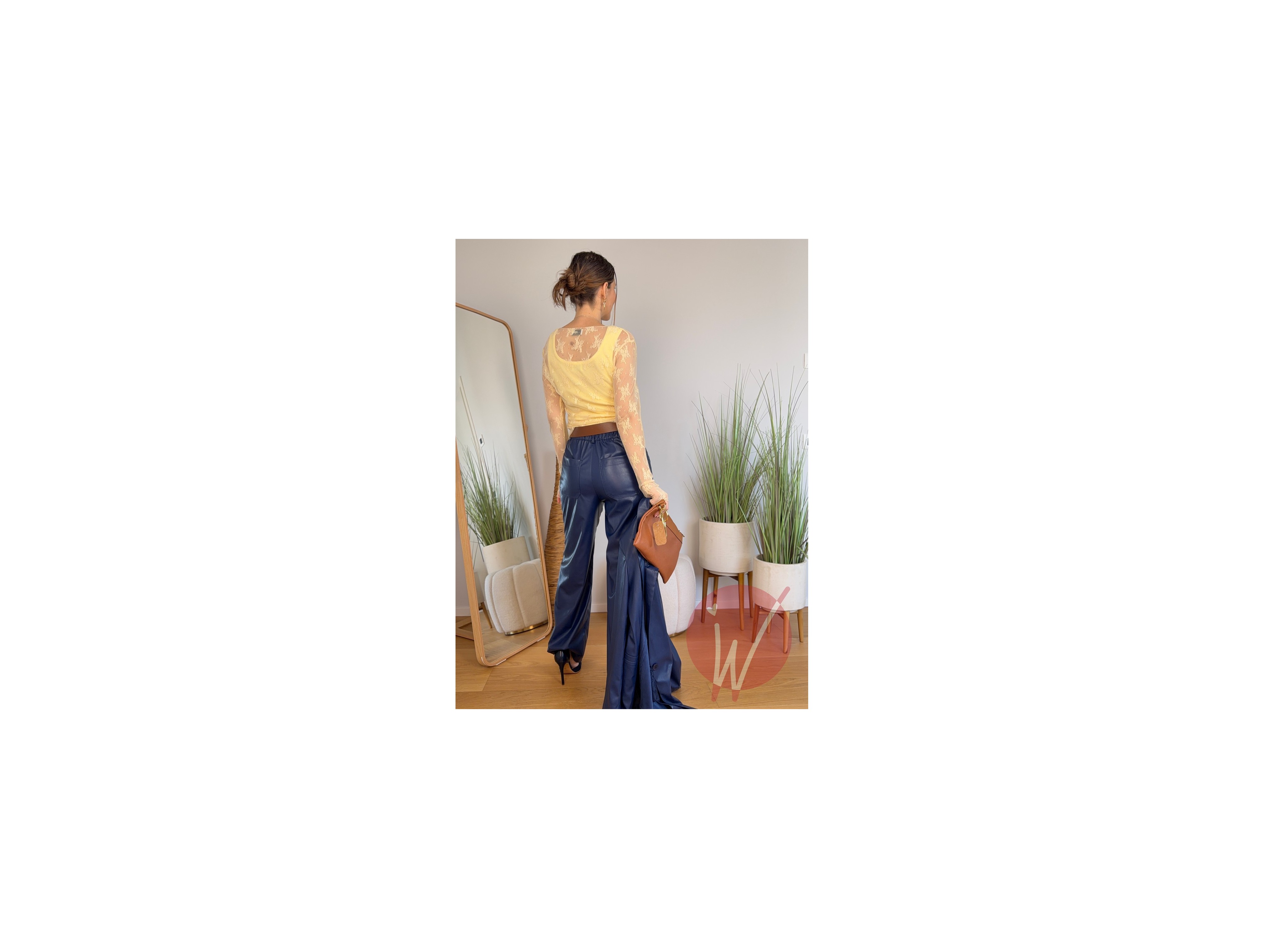Pantalone a gamba dritta in ecopelle morbida, modello 5 tasche, con elastico in vita, chiusura con zip e bottone.