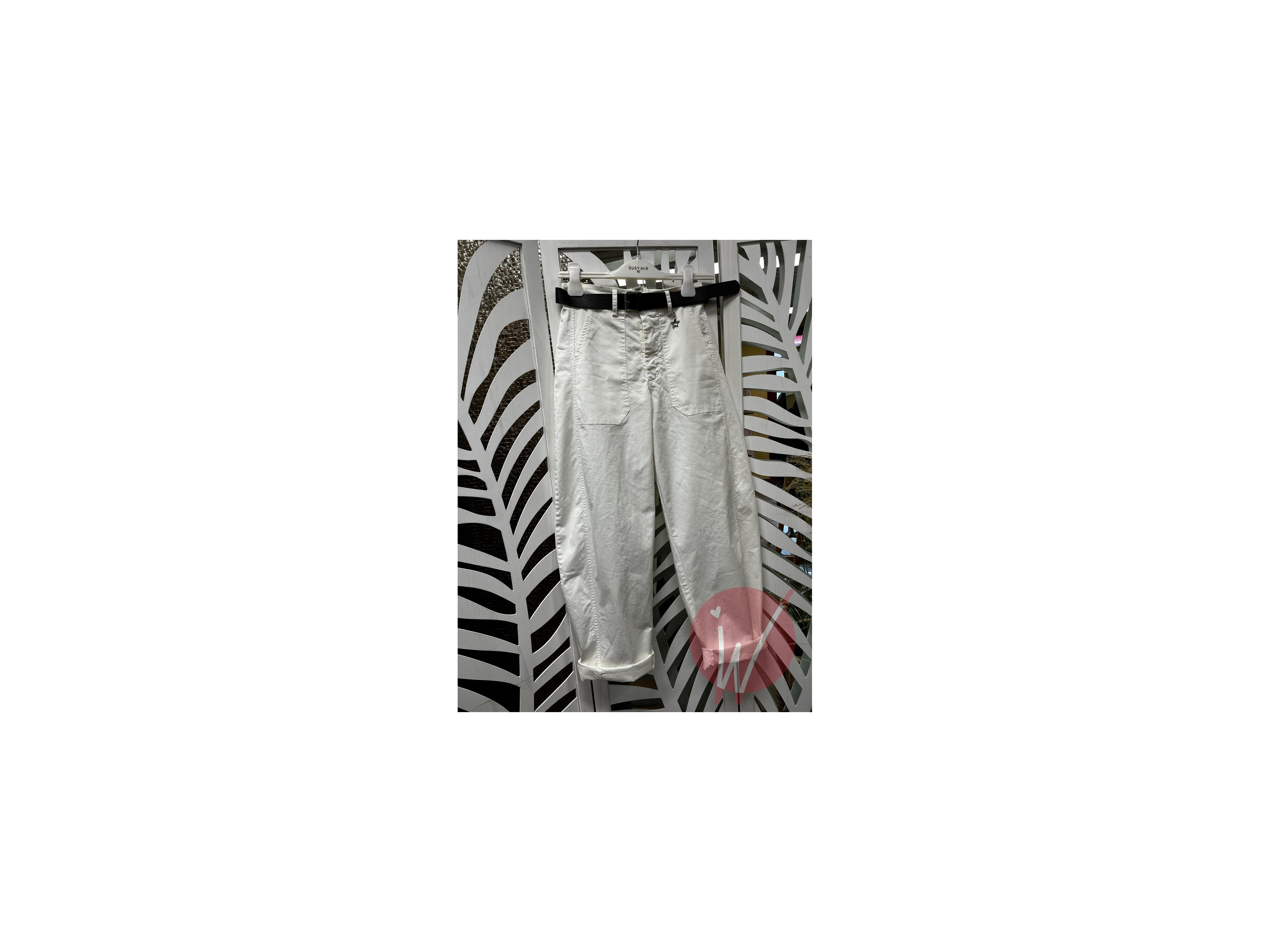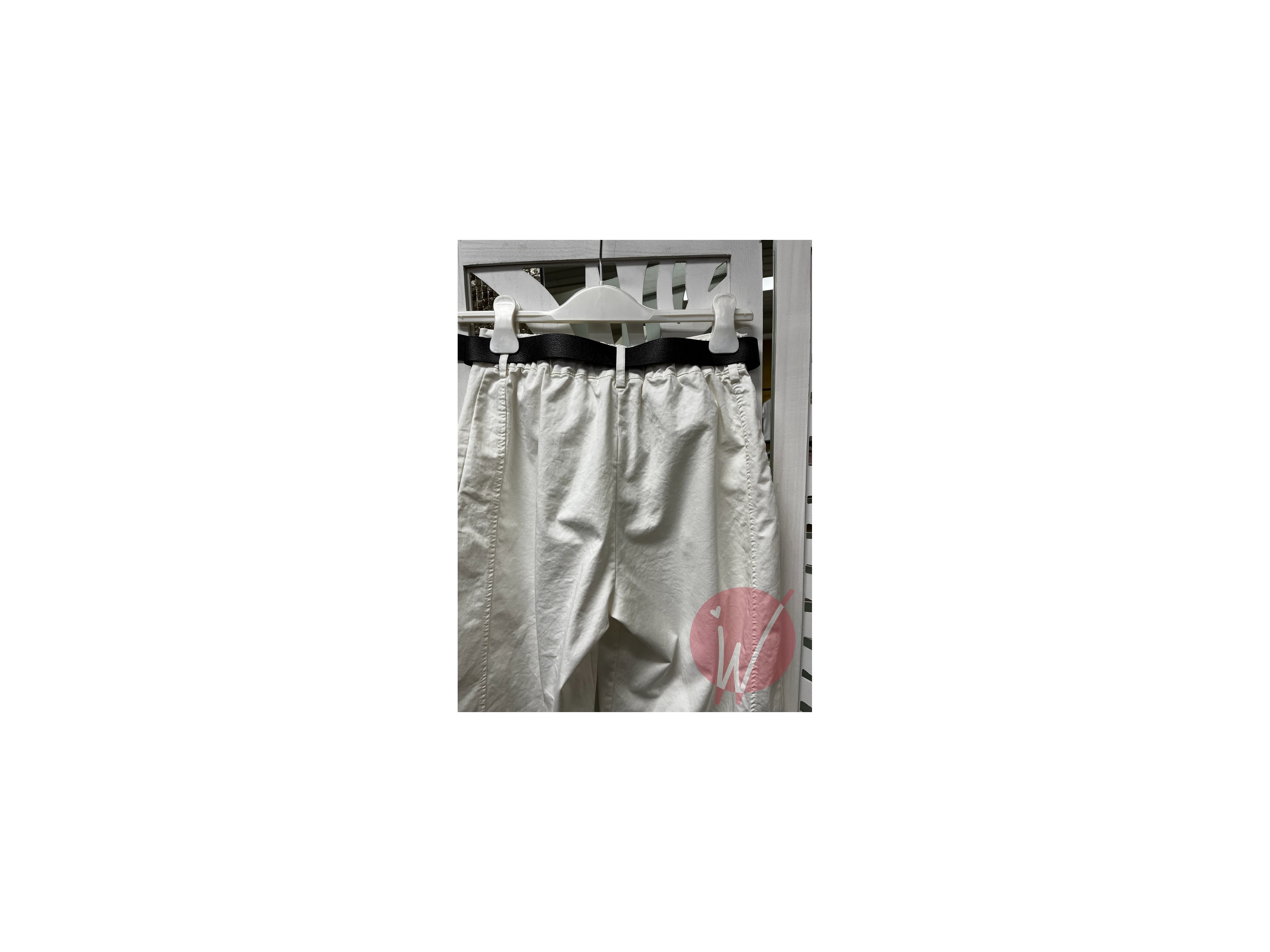 Pantalone ad ovetto, in cotone morbido un po' elasticizzato, con elastico in vita sul retro, chiusura con zip e bottone davanti, cintura inclusa, tasche in piedi laterali.