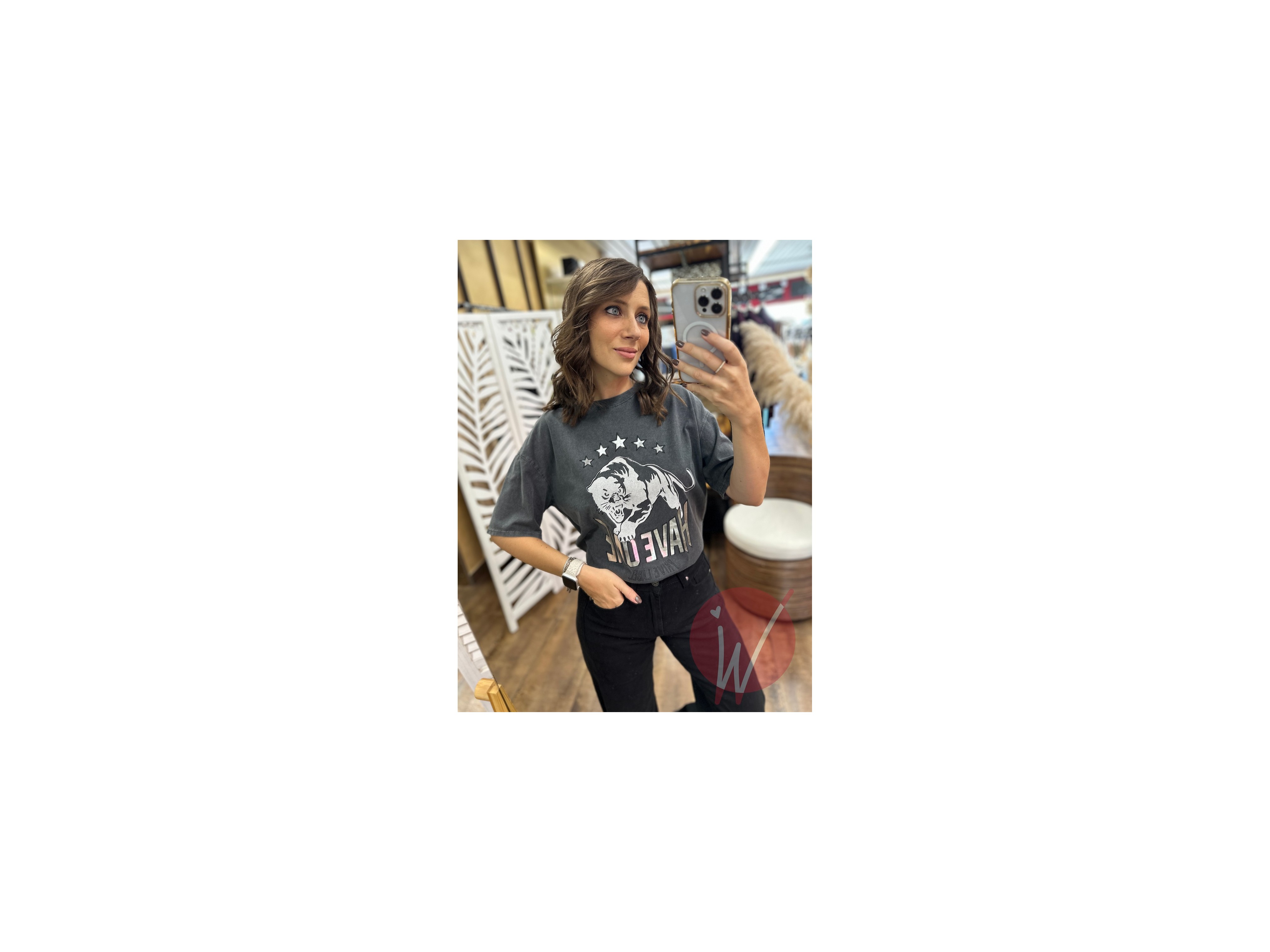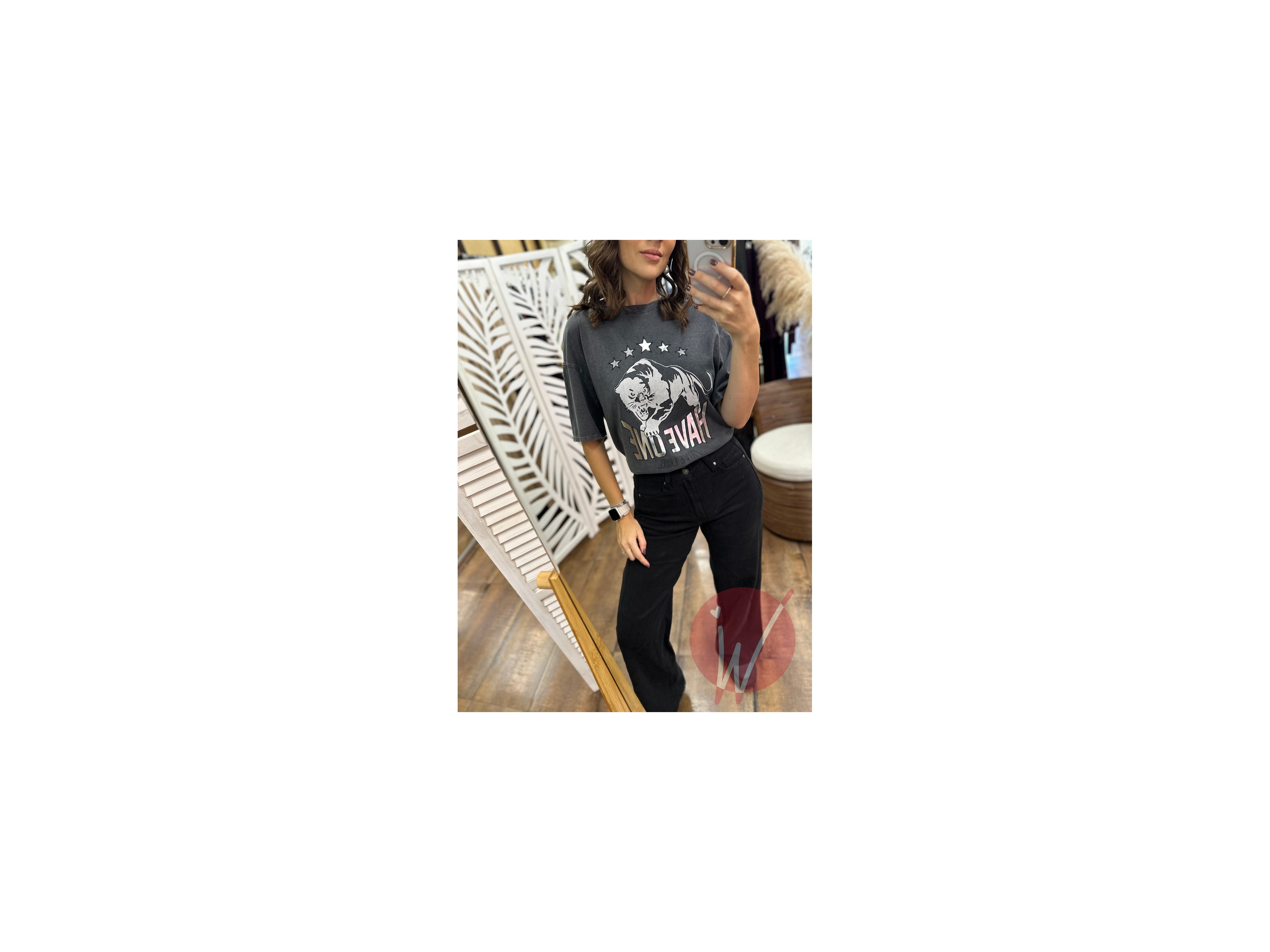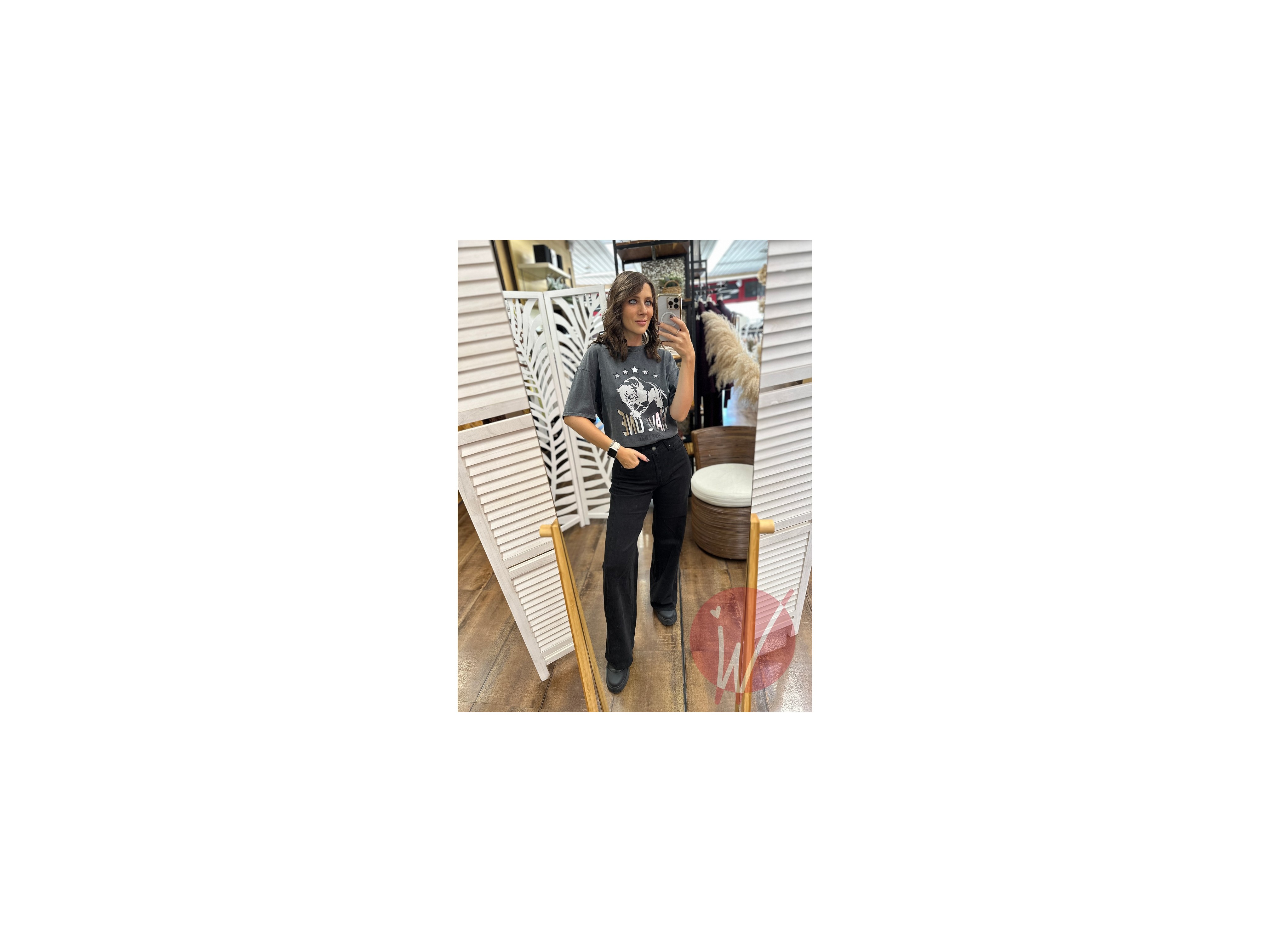 T-shirt in cotone elasticizzato, taglio over a scatolina. maniche ampie, stampa spalmata davanti.
