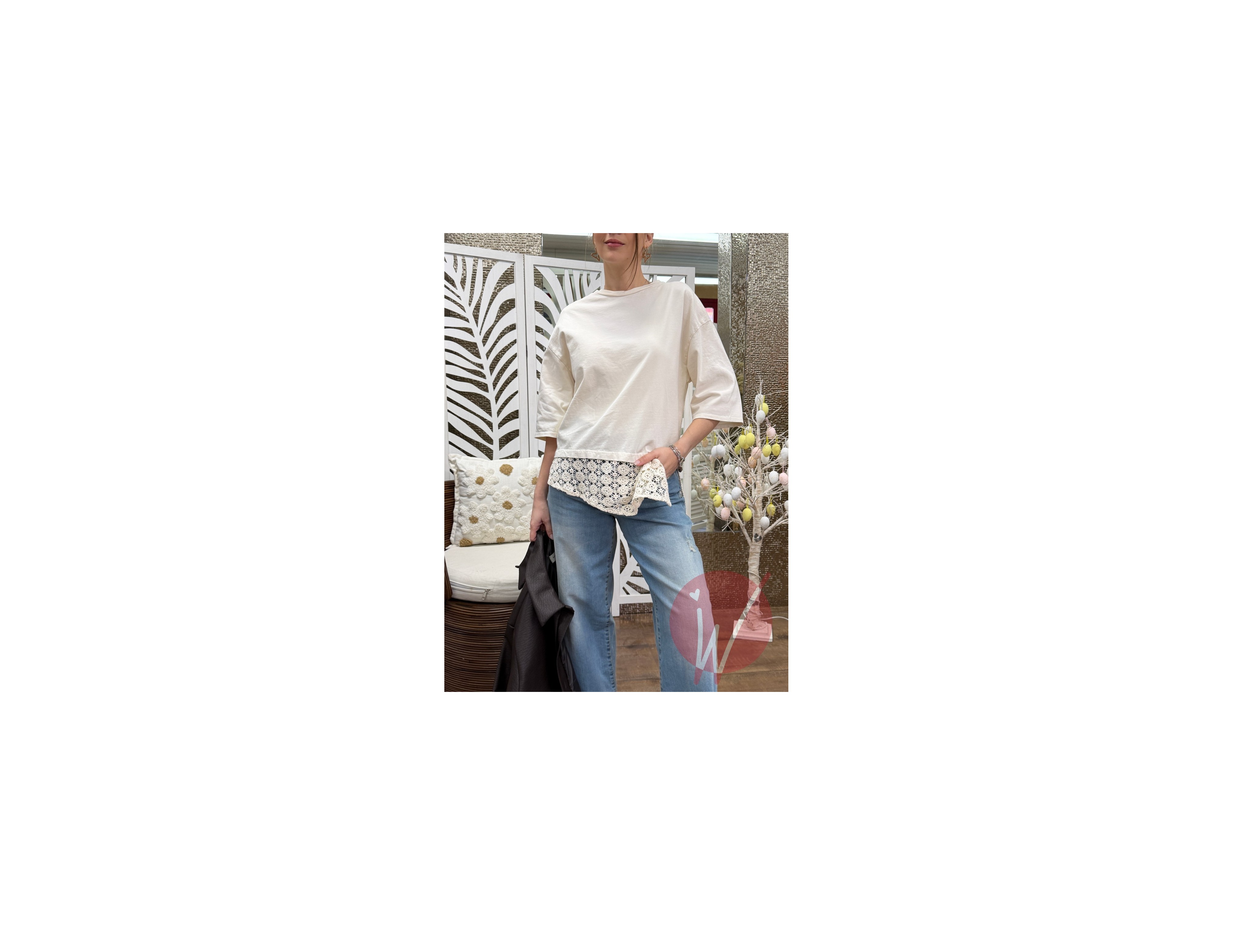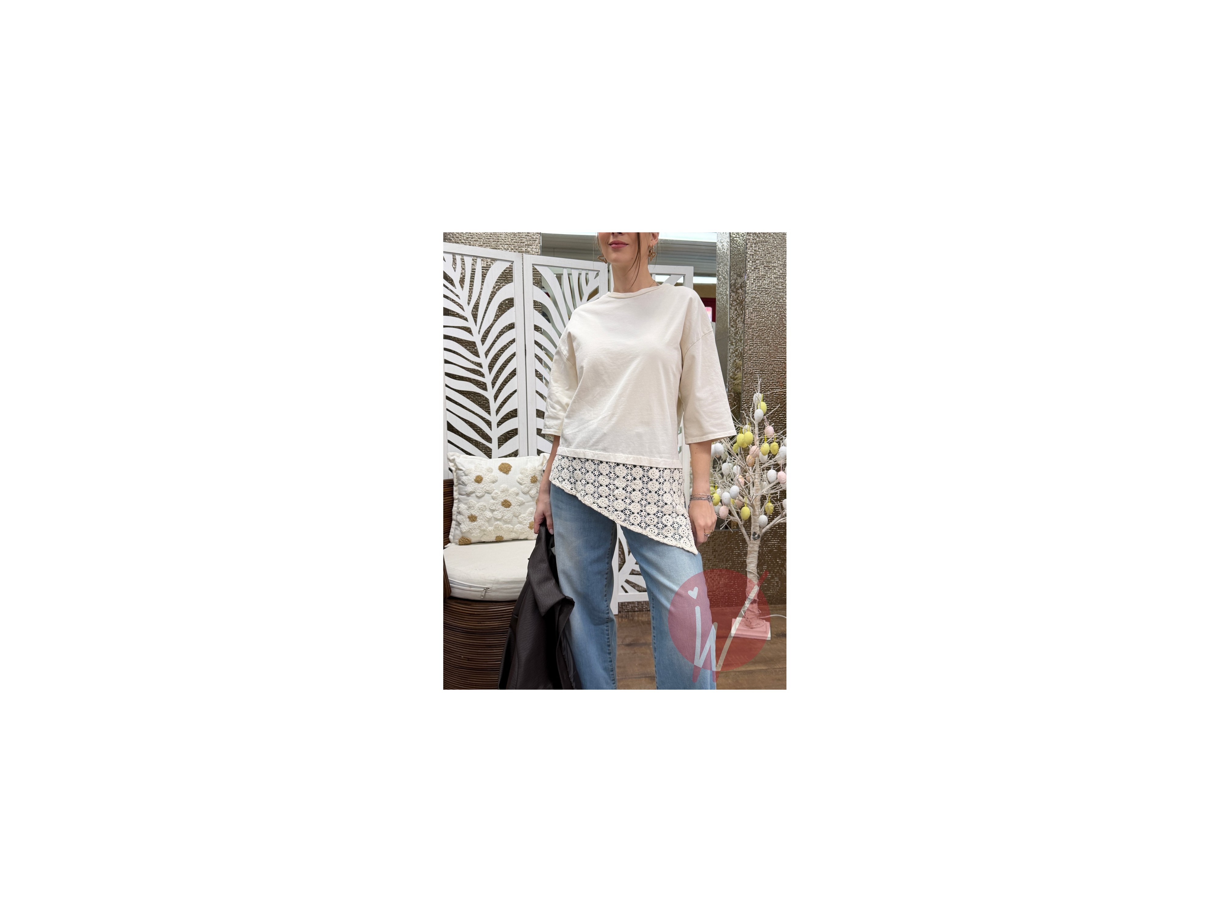 T-shirt in cotone morbido ed elasticizzato, con mezza manica con allungamento in crochet tono su tono asimmerico con spacco laterale.