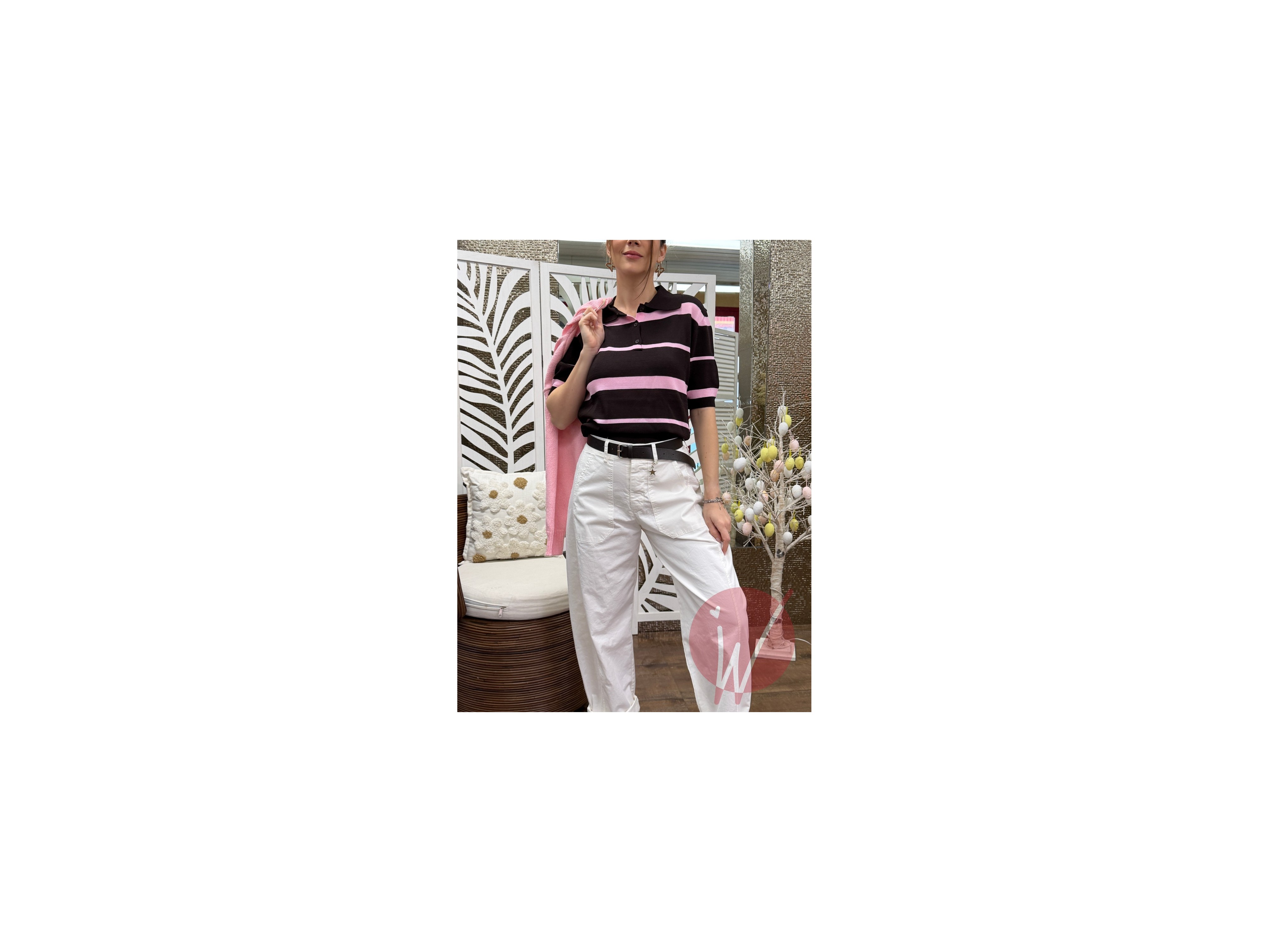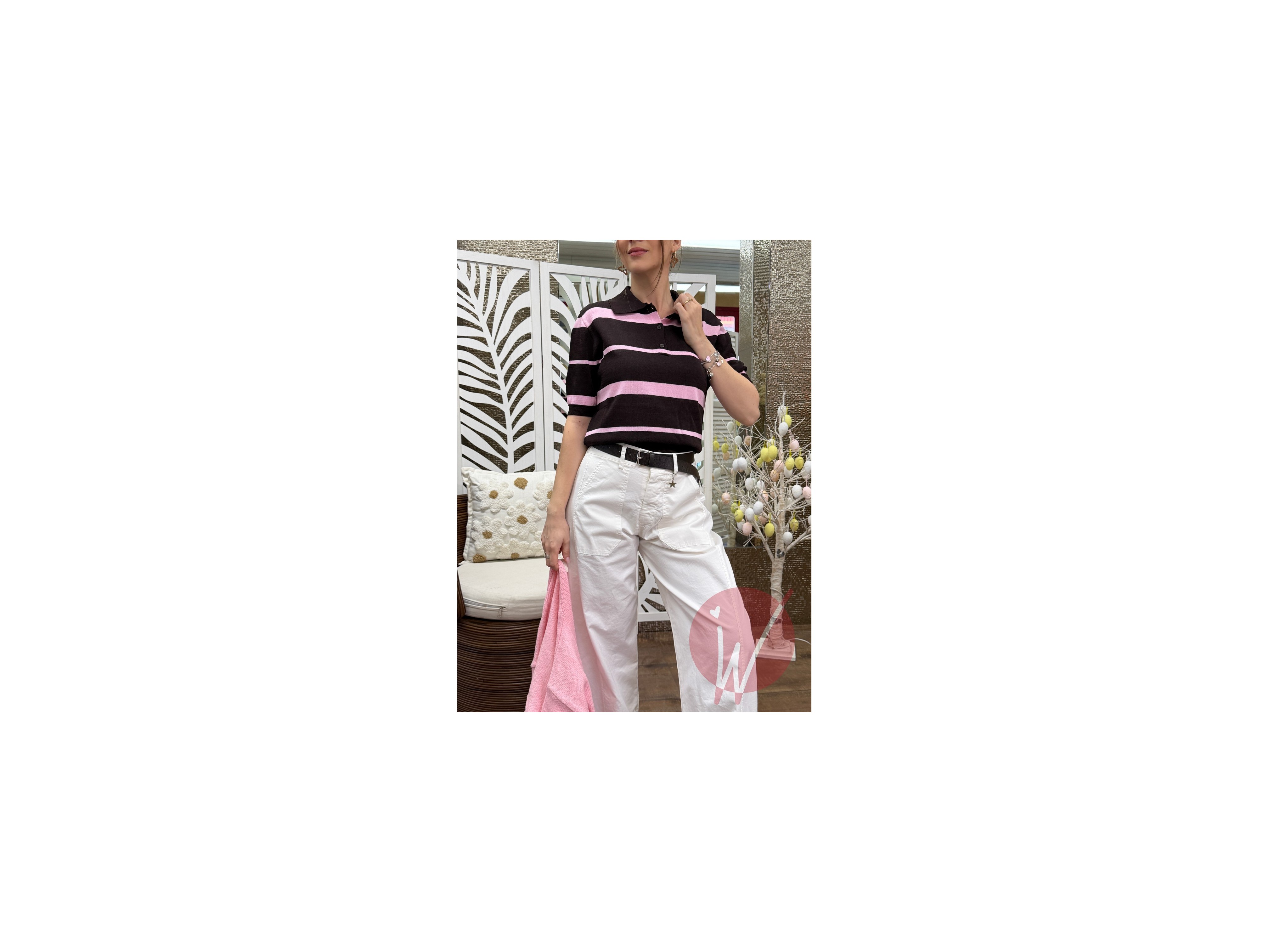 T-shirt a polo in viscosa leggera ed elasticizzata, in fantasia a righe di diverso spessore.